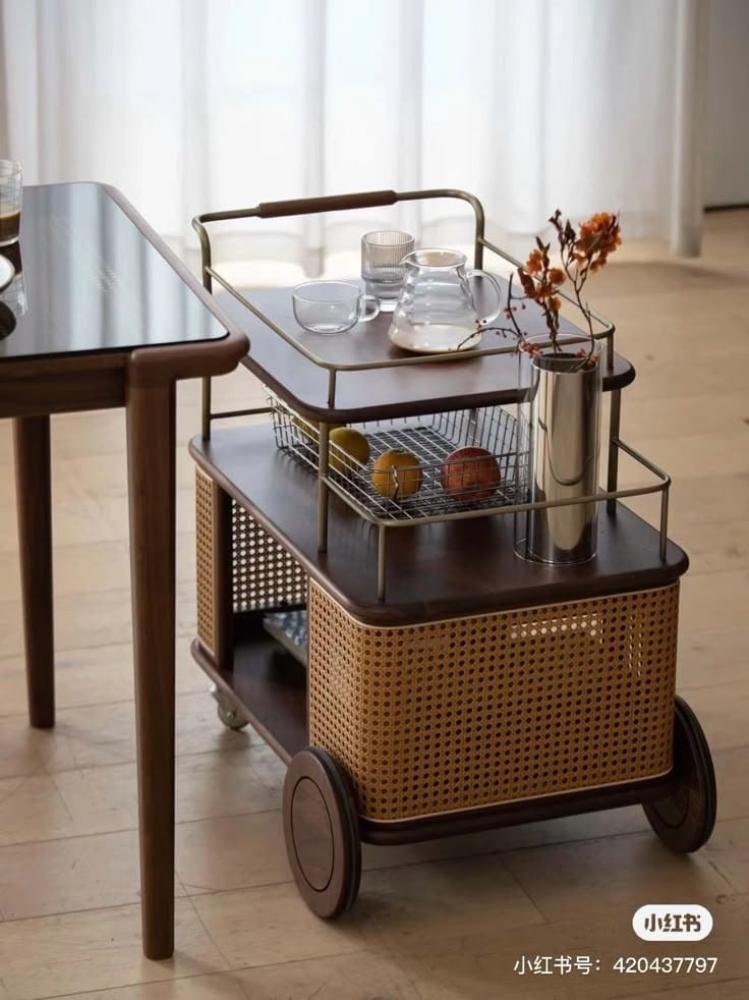 عربة تقديم فاخرة بتصميم يجمع بين الخشب الدافئ وقماش القش المنسوج، مع لمسات معدنية أنيقة وعجلات عملية تسهّل حركتها. مثالية لتقديم الضيافة أو تنظيم المشروبات والوجبات الخفيفة، مع لمسة ديكورية ترفع من مستوى أي مساحة.